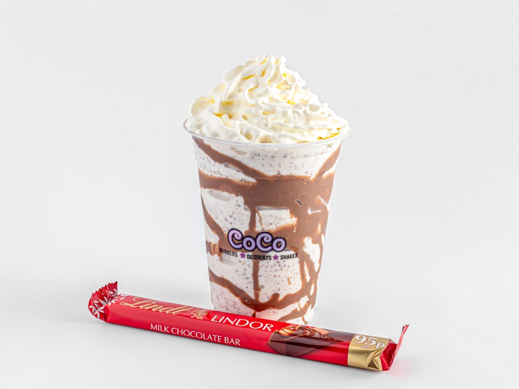 A decadent milkshake with lindor, belgian milk chocolate sauce, and fresh cream. Creating a rich and indulgent treat.