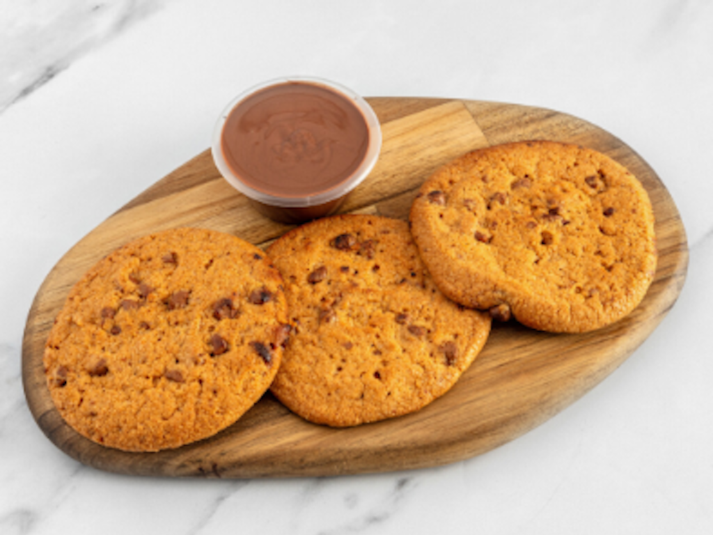 Three chocolate chip dipping cookies served with belgian milk chocolate sauce.