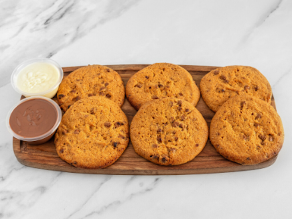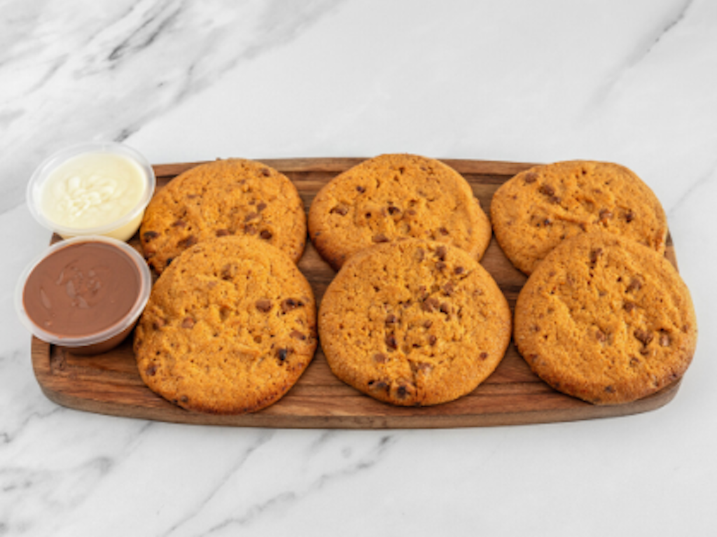 Six chocolate chip dipping cookies served with two belgian milk chocolate sauce.