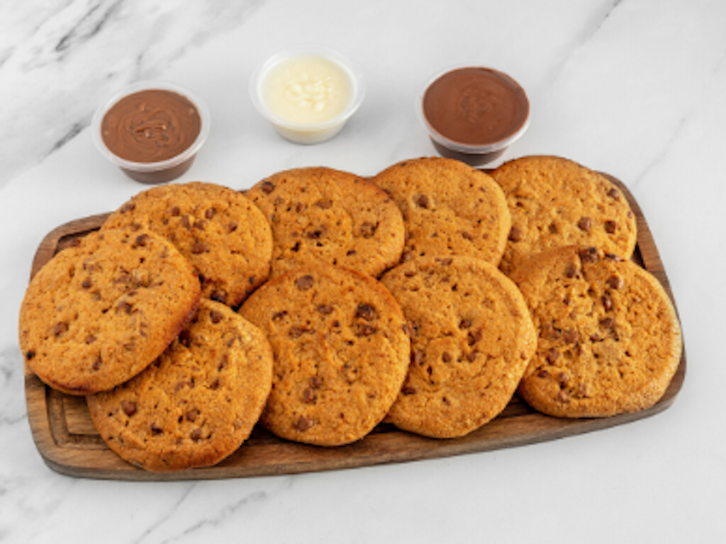 9 chocolate chip dipping cookies served with nutella, belgian milk chocolate sauce and belgian white chocolate sauce.