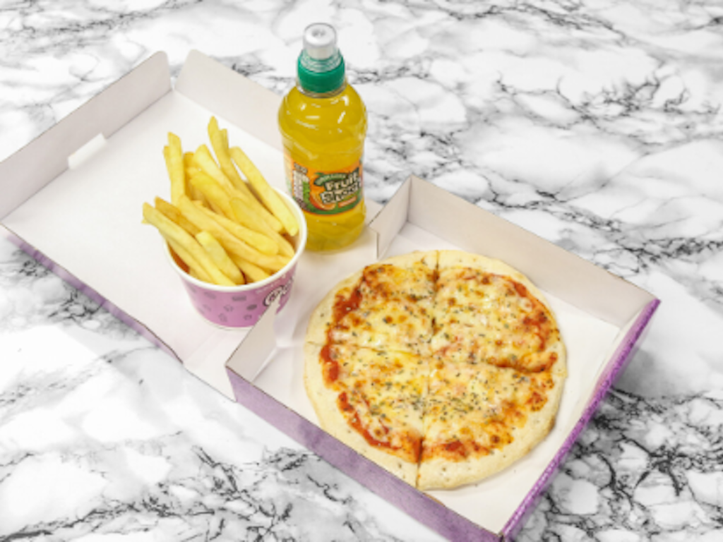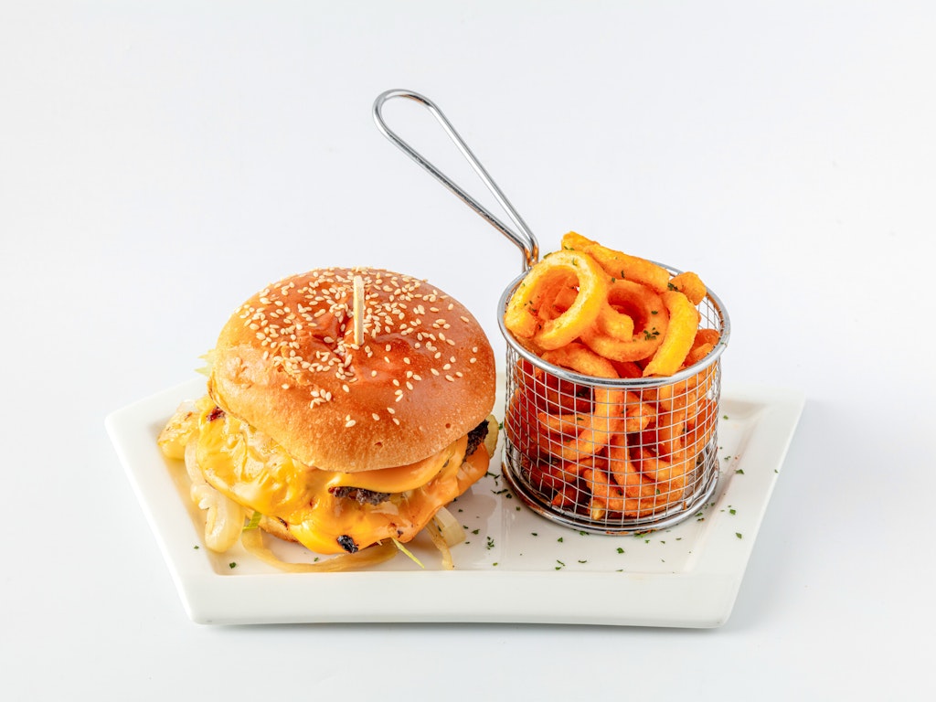 Two juicy beef patties, melted cheese, fresh lettuce, gherkins, caramelized onions, and burger sauce, all in a toasted bun. Served with fries or curly fries and a refreshing drink.