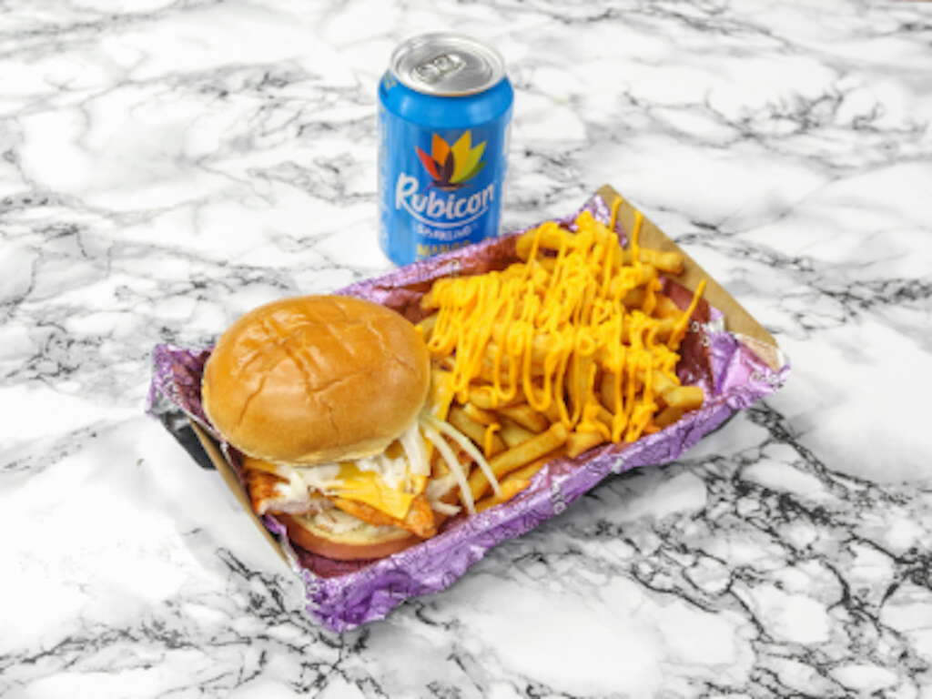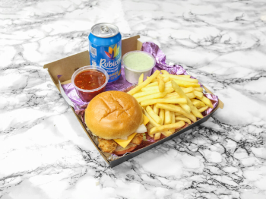 A succulent grilled chicken fillet, seasoned to perfection, topped with crisp lettuce, cheese, onions, and creamy mayo, all in a toasted bun. Served with fries or curly fries and a refreshing drink.