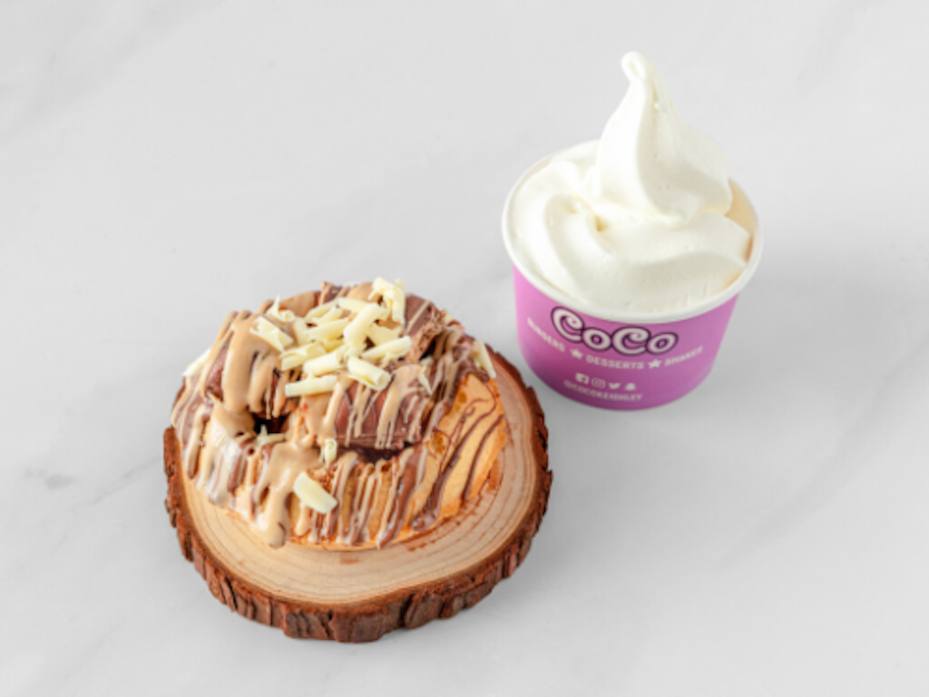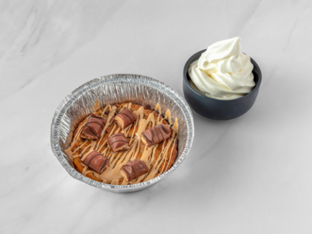 Warm and gooey chocolate chip cookie dough drizzled with bueno sauce, topped with kinder bueno pieces. Served with a scoop of whippy ice cream.