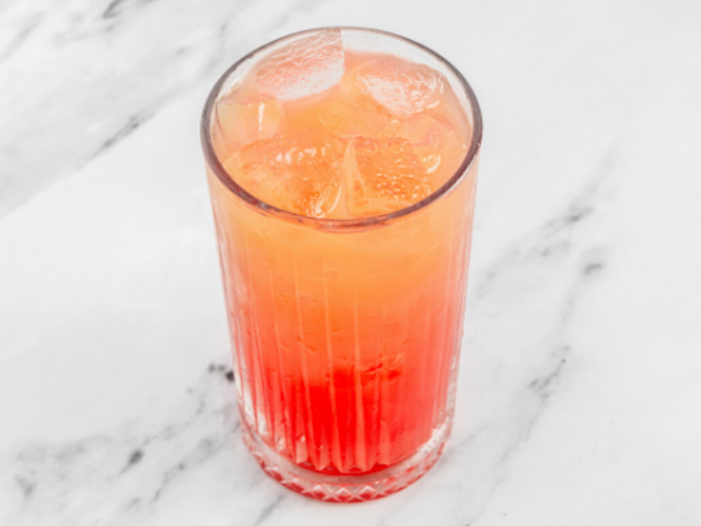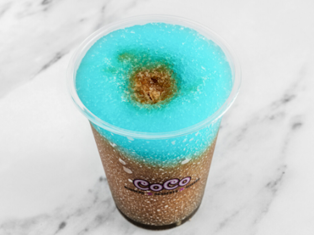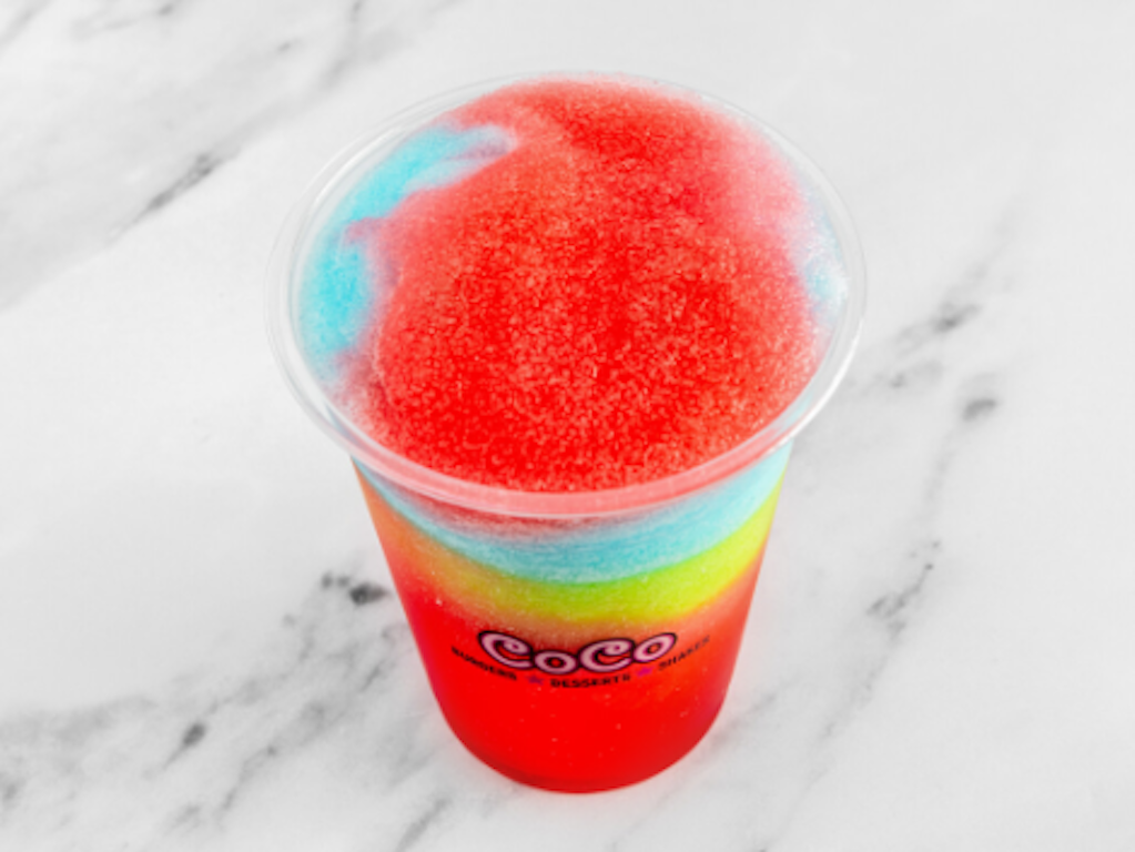 Whippy ice cream topped with strawberry and bubblegum sauce. Finished with red and blue sherbet.