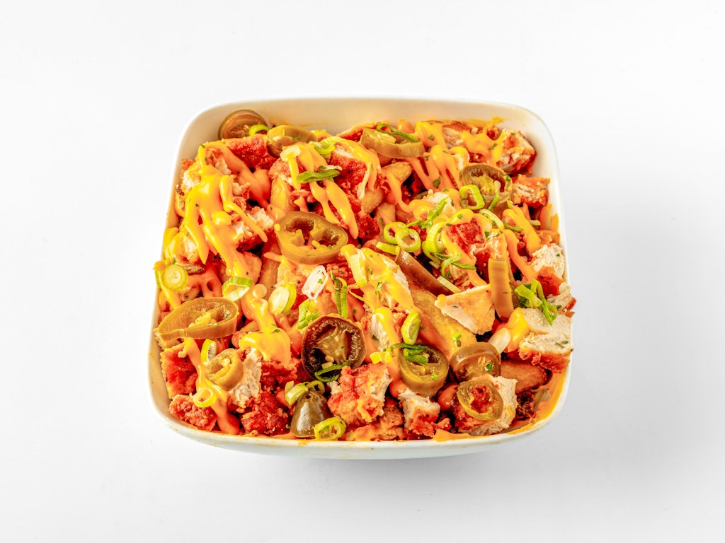 Fries loaded with juicy chicken pieces, topped with cheese sauce, jalapeños, and fresh spring onions.