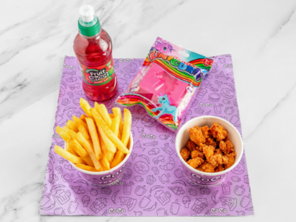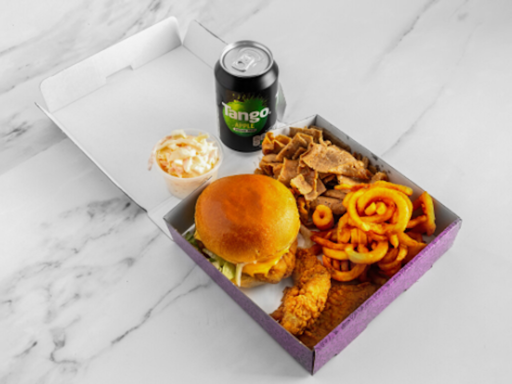Our box meal features a delicious angus beef smash burger, two crispy chicken strips, donner meat, fries or curly fries, creamy coleslaw, and a refreshing drink. The perfect combination to satisfy all your cravings!