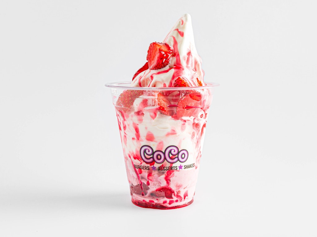 Strawberry gelato topped with strawberries, followed by a layer of whippy ice cream. Finished with strawberry sauce and even more strawberries.