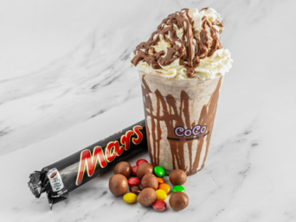 An indulgent milkshake with nutella, mars bar, maltesers, M&Ms, and fresh cream. Creating a rich, chocolaty, and crunchy treat in every sip.